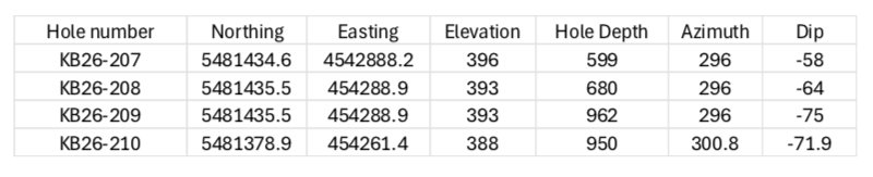 A total of 3,350m of drilling has been completed to date. The first 4 drill targets have been completed (drill holes KB26-207, KB-208, KB-209 and KB-210 outlined on Figure 1). Samples have been delivered to AGAT Labs in Thunder Bay for analysis. Assays are pending for hole KB26-210. The drill rig is currently drilling the 5th drill hole KB26-211. This hole is designed to be drilled below the existing shaft bottom to test for the depth extension to the deposit.